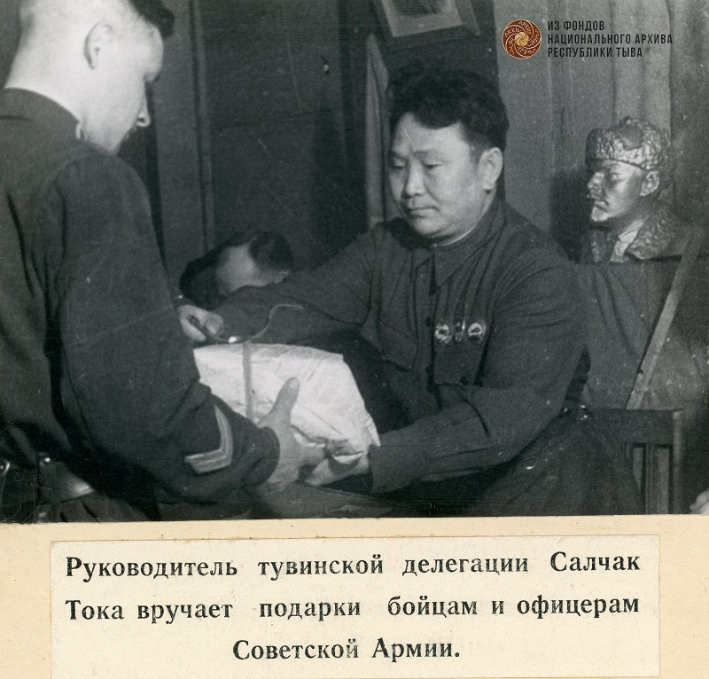 В Кызыл стекались гурты овец и коров, табуны лошадей, караваны верблюдов, нагруженные подарками. Со всех концов земли тувинской эти красные обозы шли день и ночь. Сопровождать их доверяли самым лучшим, самым достойным. За дни Отечественной войны из числа трудящихся, рабочих, служащих и домохозяек выявились лучшие люди, принимавшие активное участие в организации работы по отсылке подарков Красной Армии. Тувинские девушки писали письма советским воинам, приложив к ним вязанные носки и варежки. А те – тоже – им в ответ, и благодарили за подарки.