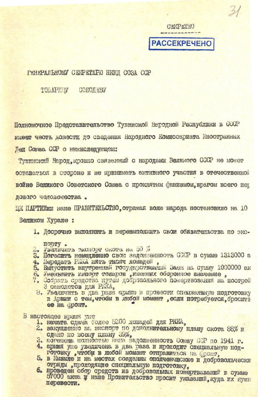 Телеграмма Генерального секретаря Народного Комиссариата иностранных дел А. Соболева Полномочному представителю ТНР в СССР тов. Намчак с благодарностью за помощь тувинского народа народам СССР.