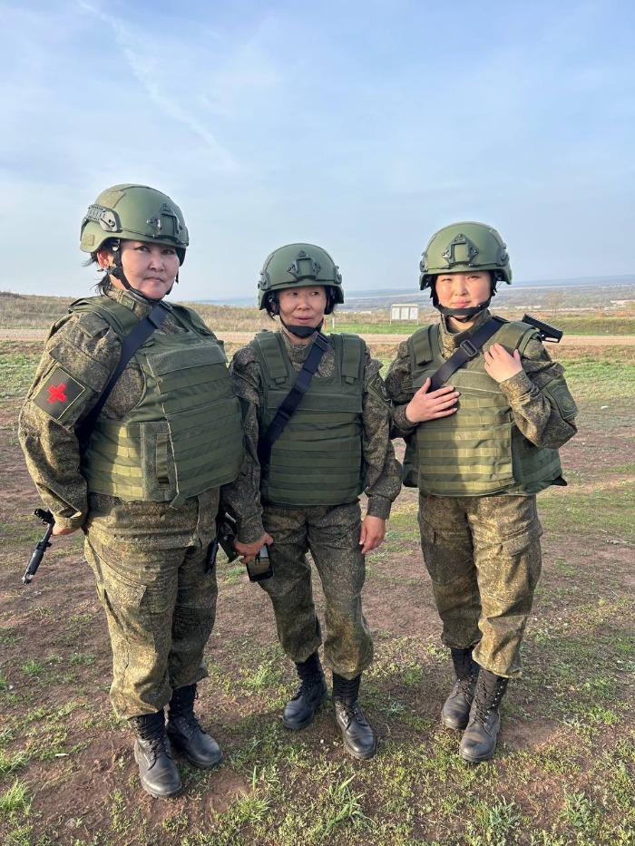 Тувиночки-медсестры Алдынай Натпий-оол, Буяна Кужугет и Виктория Молдурушку на полигоне части во время учебки