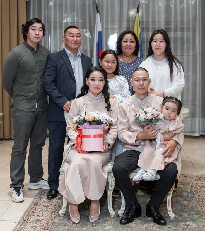 На бракосочетании старшей дочери. Слева направо: сын Болат, Борбак-оол Допчааевич, младшая дочь Радмила, супруга, средняя дочь Сандана. В первом ряду старшая дочь Олча, её супруг и дочь