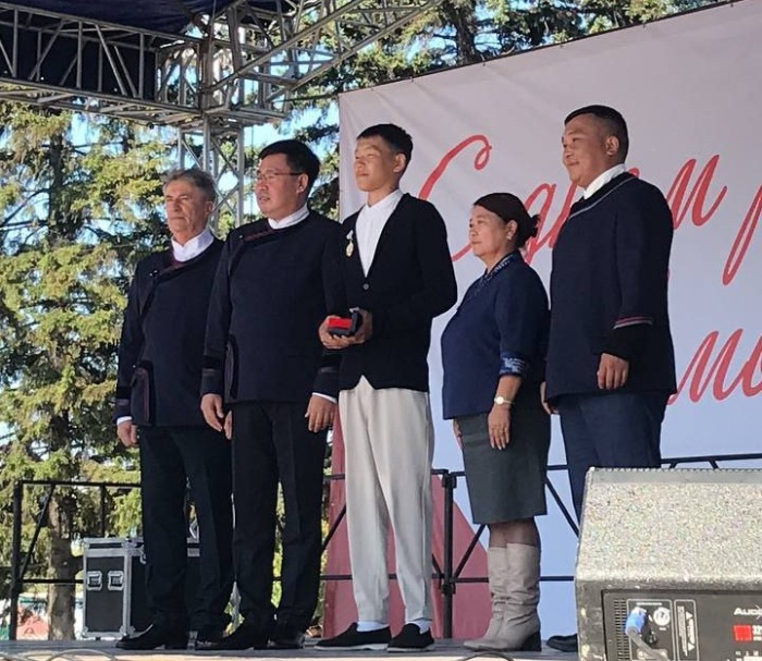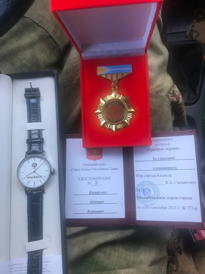 Старший сын Айжаан получил из рук мэра часы и медаль «Храброе сердце» за спасение утопающего. День города, 2025 год.