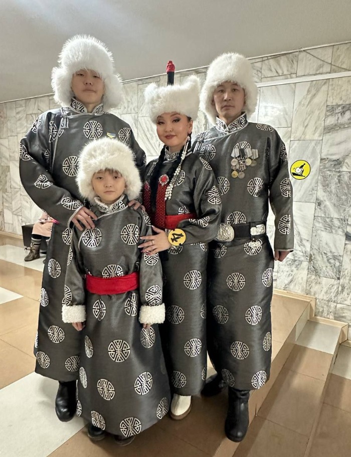 Солангы Ховалыг с супругом и детьми в национальных нарядах, пошитых для семейного этапа Республиканского конкурса среди матерей «Кадын – 2025».